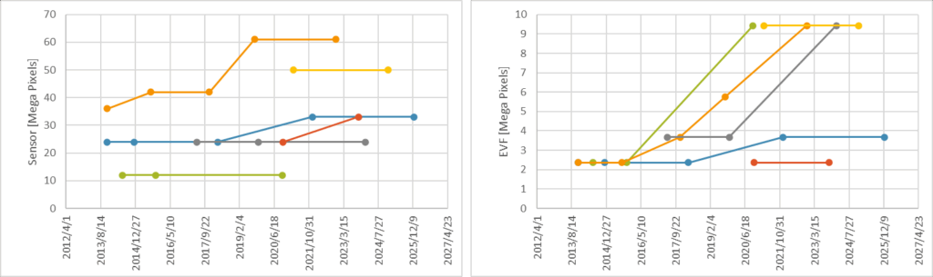 センサー画素数とEVFドット数は、先代からキープ。ただし、センサーは部分積層になった。EVFはα1 II, α9 III, α7R Vとは違い、先代α7 IVから流用のようだ。グラフにはないが、背面液晶は高画素化し、バリアングルからマルチアングル(4軸チルト)になった。個人的にバリアングルは好きじゃないので、これは歓迎。