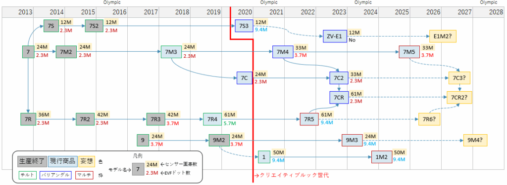 以前も掲載したSonyの系譜を更新。今後の機種の登場時期(適当予測)は当たるかな?