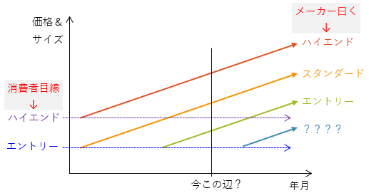 ・・・超順調に価格と質量が成長を続けている。値段は見事にリニアに上がってる。なお、価格はそれぞれ発売当時の販売予想価格をプロットしている。