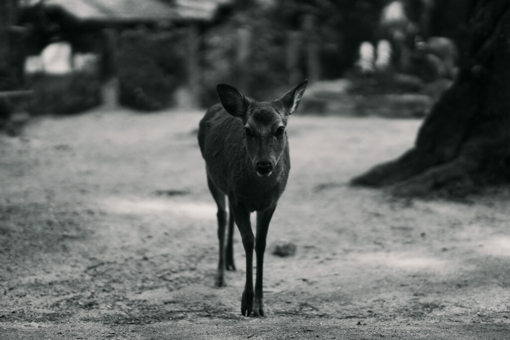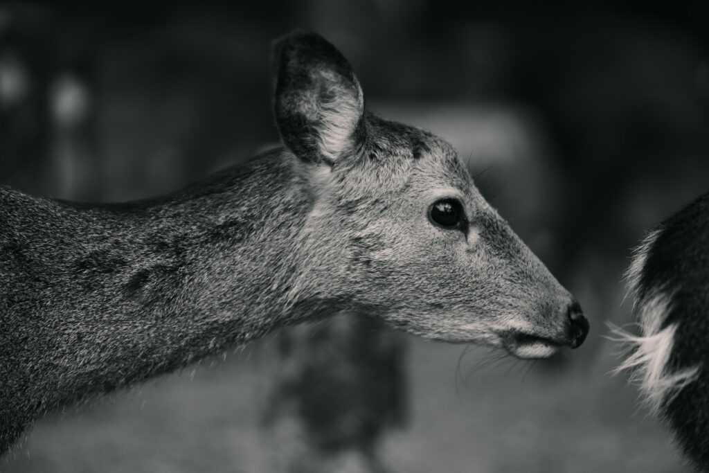 ふと背中に視線を感じると鹿がいた。モノクロモードになっていたので、そのまま撮る。RAWじゃなくてHEIF撮影なので、カラー情報はない。