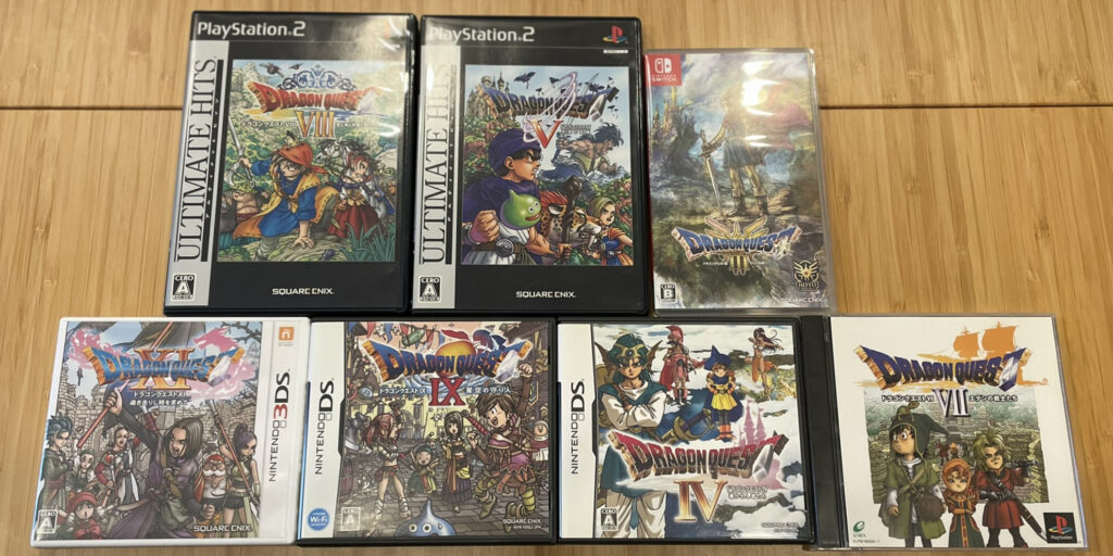 どうでもいいけど、今手元にあるDQ過去作。SFCの3, 5, 6は実家にある。