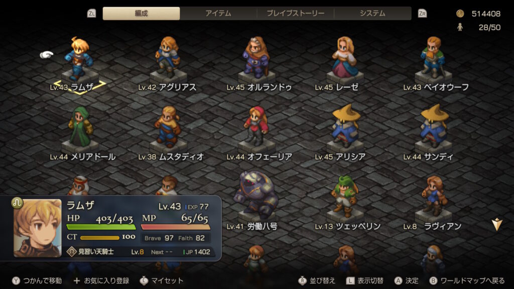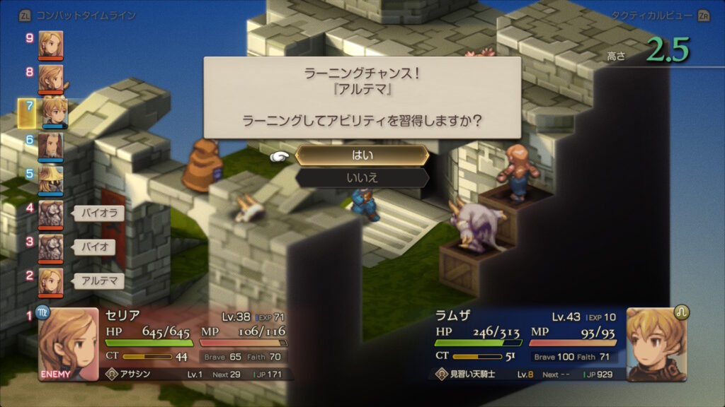 ラムザは最低限、算術を覚えさせたけど、ベイオウーフもそうするべきだろうか? また、ジャベリンが強いので、レーゼをジャンプで運用するか、格闘で運用するかも悩む。アグリアスは鍛え直し中。