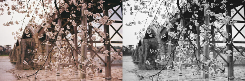それぞれ左はカラーバランスが良くないので印象は悪いが、モノクロにすればこの減点を食らうことがない。右のモノクロがいい写真だとは思わないが、相対的には多少マシだ。