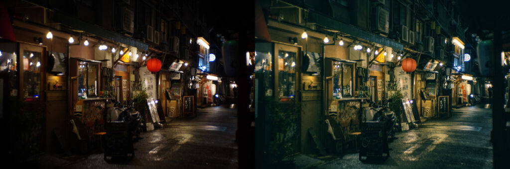 夕焼けをより赤くする、緑の暗部を青にシフトする、シャドウをシアンに転ばせる、赤をオレンジ側にシフトさせる、一部の色相のみ彩度を下げる/上げる、など人為的にカラーをいじり、バランスを崩壊させずにバランスを変えることは可能だ。フィルムシミュレーションはその代表例だ。使い古されてもなお、ティール&オレンジもその一つだ。