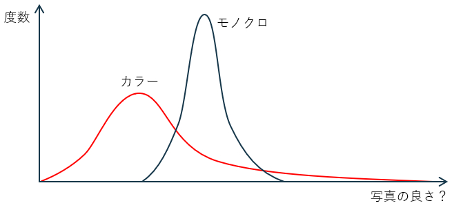 私のイメージはこのような感じ。写真の良さという観点において、カラー写真の中央値に対して、モノクロ写真の中央値の方がはるかに高いと思う。しかし、上限はカラーの方が高いと思う。これは単に私の個人的な意見だ。
