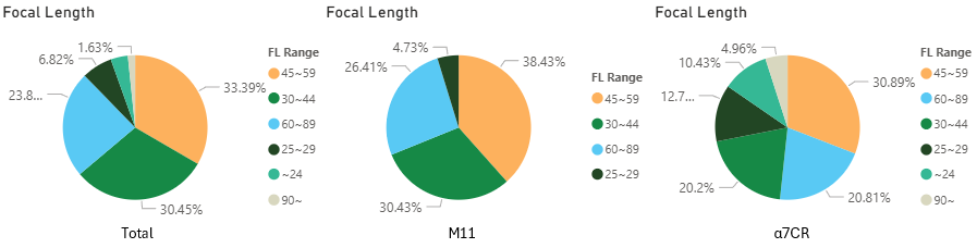 今年に入ってからのトータル、M11、α7CRそれぞれでの焦点距離域別の割合。