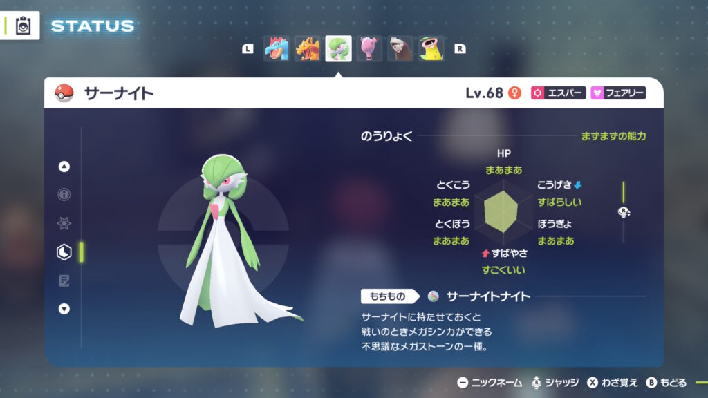 そしていつも通り、旅パの個体値に絶望するタイム。このサーナイトは予約特典のサーナイトナイトを持ってきたラルトスを進化させたやつやで? そしてラスボス戦、ほぼこのサーナイトだけで完封したのに。ドレインキッス最強。