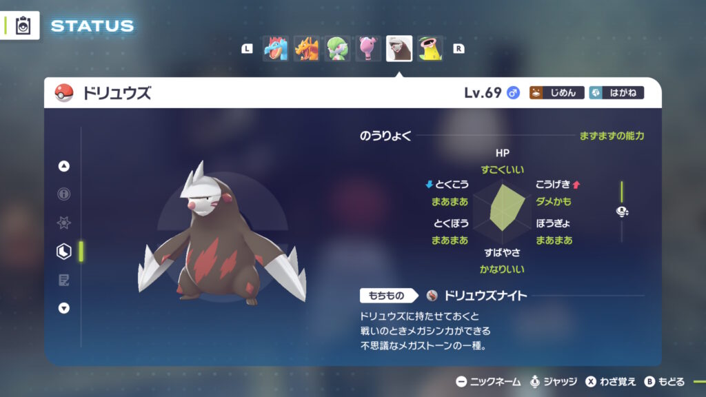 ドリュウズの攻撃:ダメかも、かよ。うちのメイン物理アタッカーだったのに。対戦とかしないので、種族値が支配的で、個体値とか関係ないけどさ。