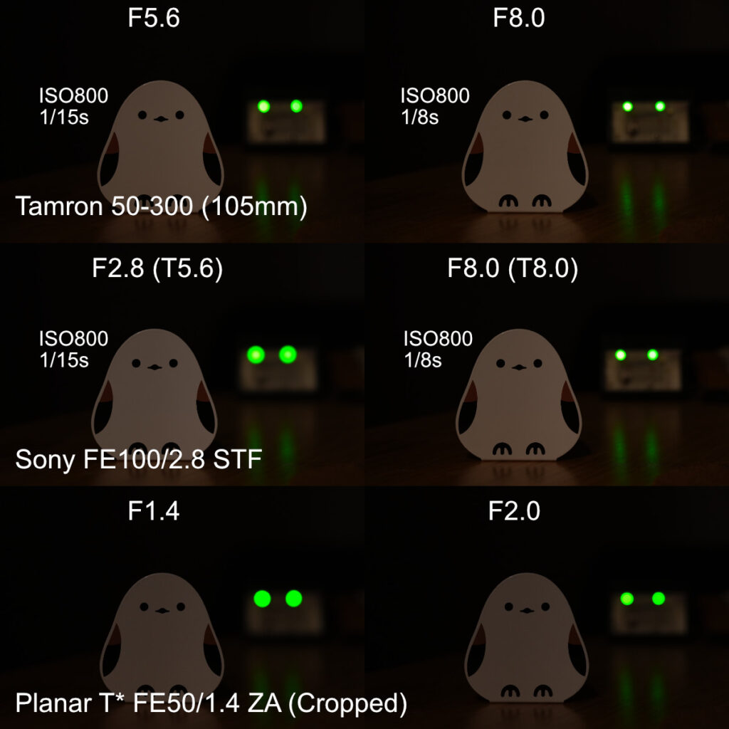 STFのF2.8 (T5.6)のボケ量は、TamronのF5.6よりも明らかに大きい。