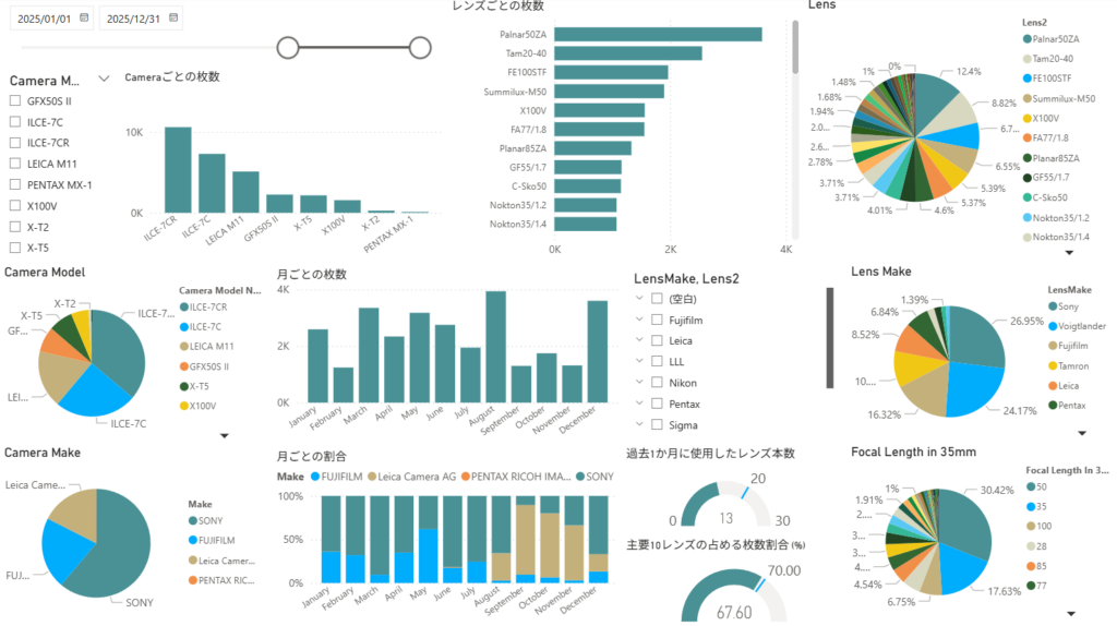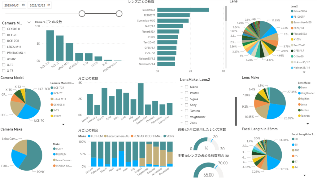 上記の記事投稿から年内いっぱいの写真を追加して再度ダッシュボードを更新。旅行に行っていたので、Tamron 20-40/2.8が総合2位にランクアップした。主要10レンズの占める割合も67.6%まで改善。