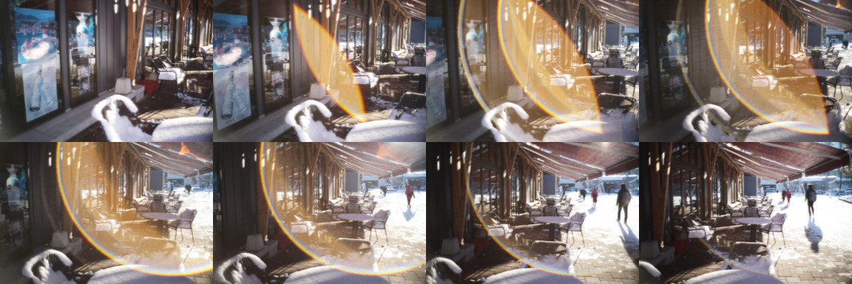 虹色フレアの実験。左から右へ、少しずつ角度を変えて撮影した。浅いけど、フードは付けている。