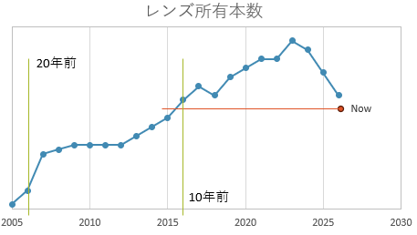 なお、代わりに手持ちのレンズ数本や、細々したカメラアクセサリ多数を売って、それなりに資金を回収した。下図に示すように、総レンズ本数は10年前の水準まで減った。ちなみに20年前は・・・あー・・・無理だな。図を見ると、私は20年前に沼にはまったようだ。でもここ3年で結構本数を減らしてきたことも分かる。
