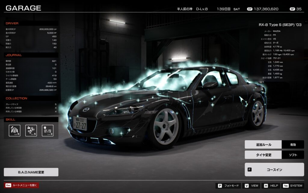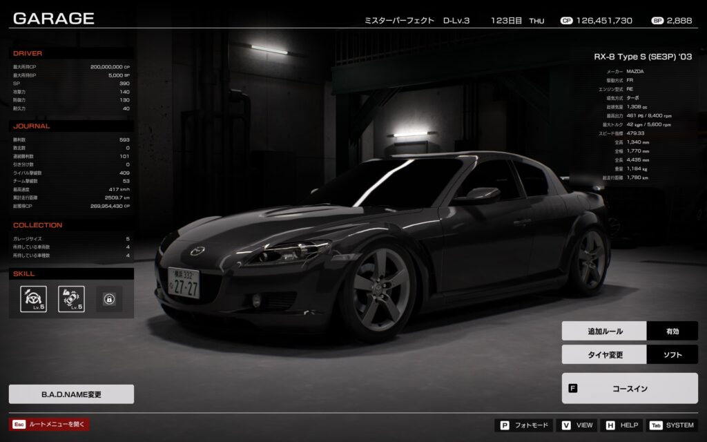現在、約300勝0敗。買った車はAE86, RX-8, R35のみというチート状態。でもEnjoyモードとはいえ、序盤はBPが全然稼げないので、そんなにばんばんチューニングを進められるわけでもないということが分かった。BP足りない。エンジン載せ替えしたい。