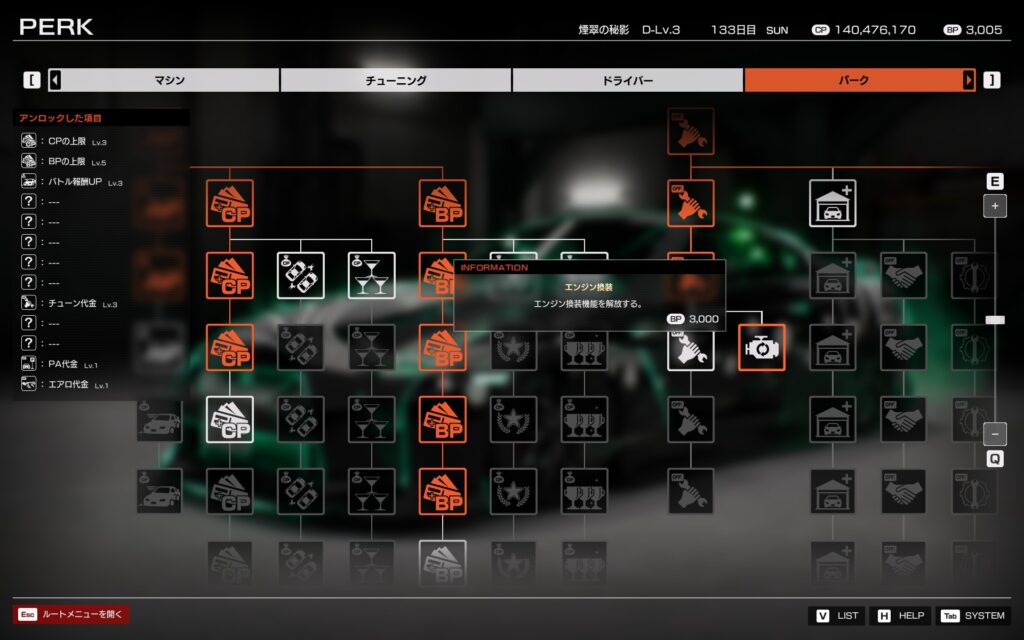 とりあえずストーリーは放置して、レベル18以下くらいのライバルとバトルを楽しみつつ、CPとBPを稼いで、新しい車とか買うか。それともBPの配分をミスった気がするし、そのうち最初からやり直すか?